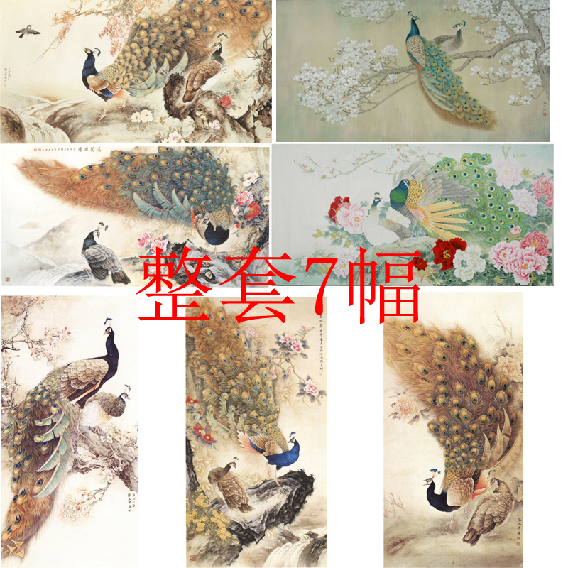 工笔画底稿4尺 孔雀竖幅横幅白描打印稿7张组合热门设计联盟服务商