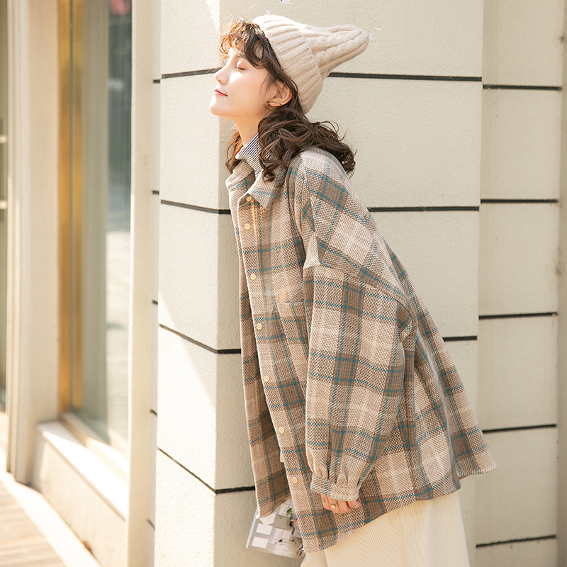 加绒加厚格子衬衫女宽松韩版设计感2021秋冬新款复古港味衬衣外套热门设计联盟服务商