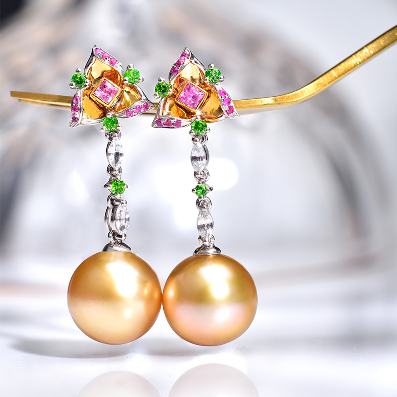 兰花瑾珠宝 南洋金珍珠耳坠吊坠戒指套装团购 正圆18K金宝石镶嵌热门设计联盟服务商