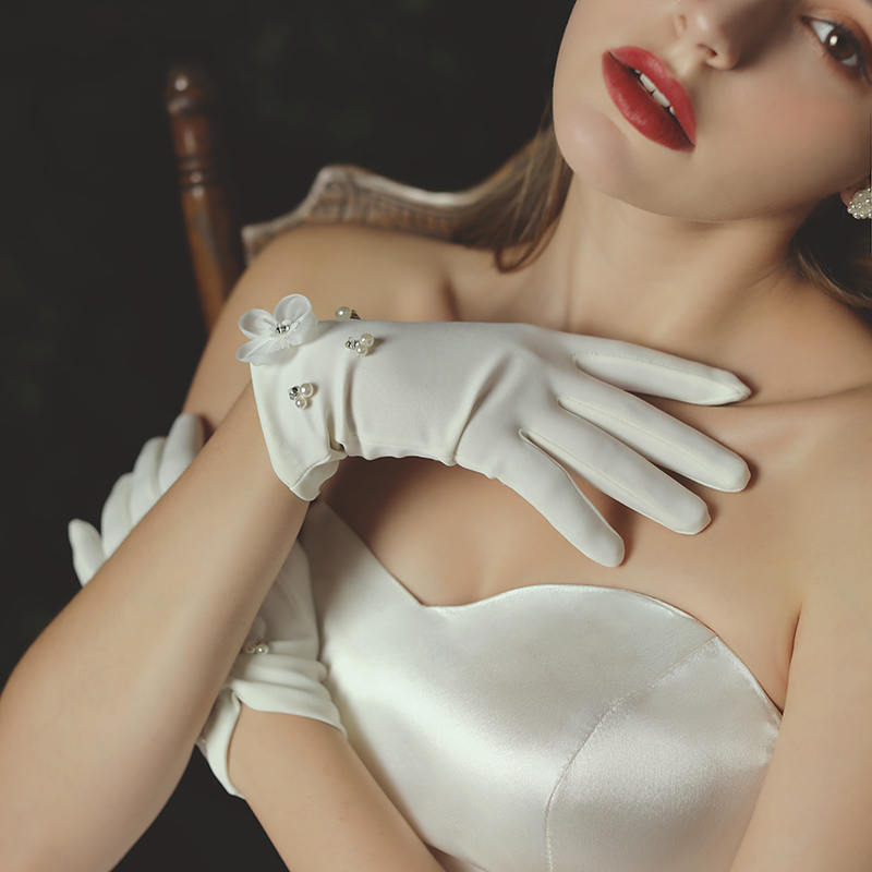 高档缎面白色花朵全指婚纱手套礼服旗袍婚礼礼仪演出新娘手套奢华热门设计联盟服务商