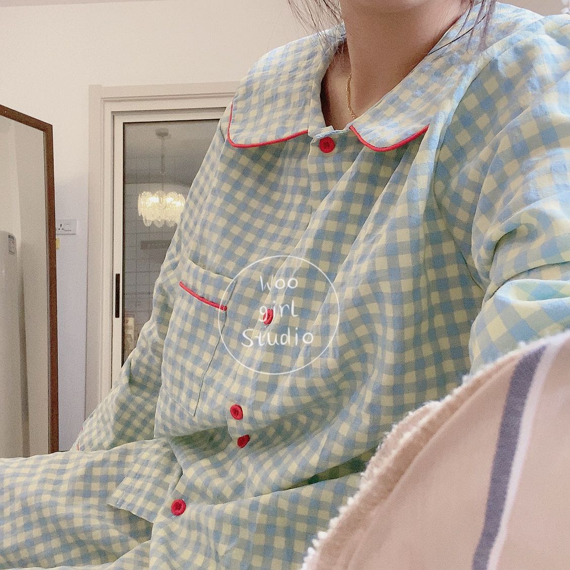 hellwoogirl自制韩国ins同款撞色设计可爱格子公主风睡衣套装热门设计联盟服务商
